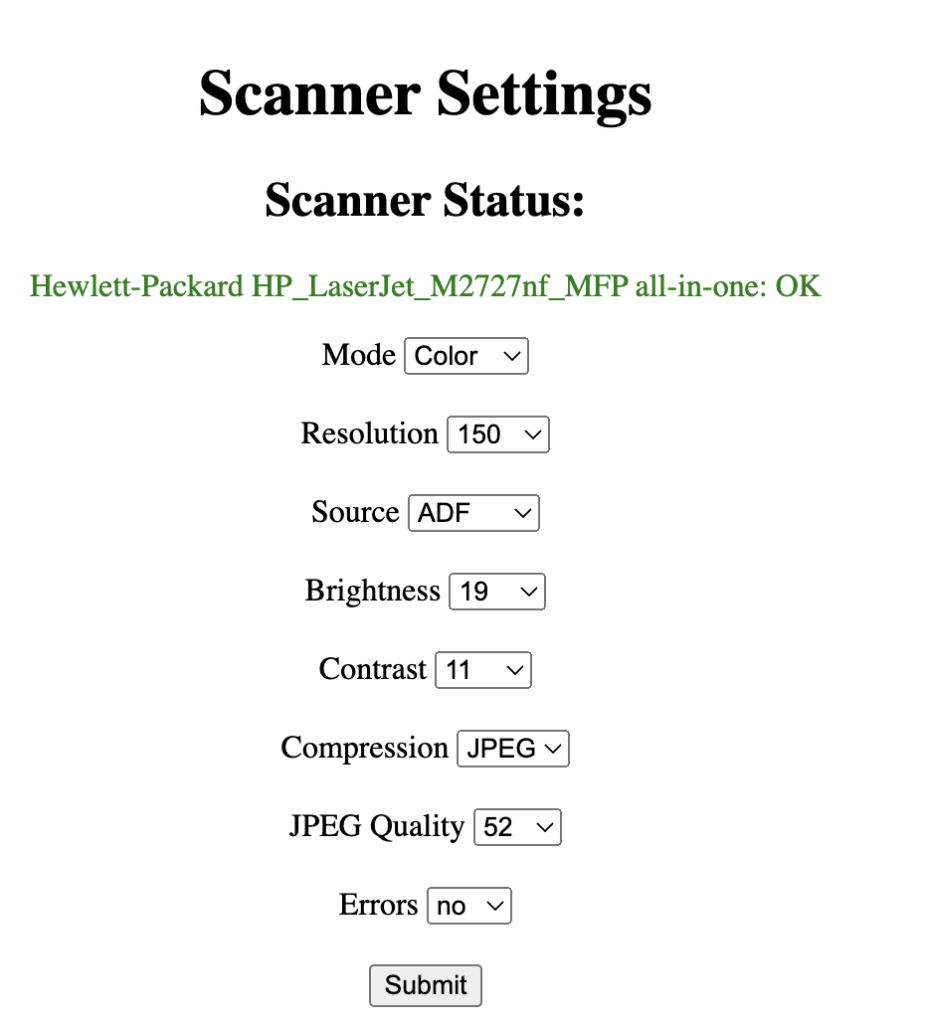 Bottom line: this works. Plop paper in the feeder, wait 59 seconds or less (the cron job runs every minute - checking to see if there is paper) and it scans, uploads to dropbox, deletes the local file. It works remarkably well. I even made a little web page to manage the settings. Here’s the code on Github. The API doesn’t work yet … but it will soon - then Alexa integration (its already connected to a cloudflare tunnel.)